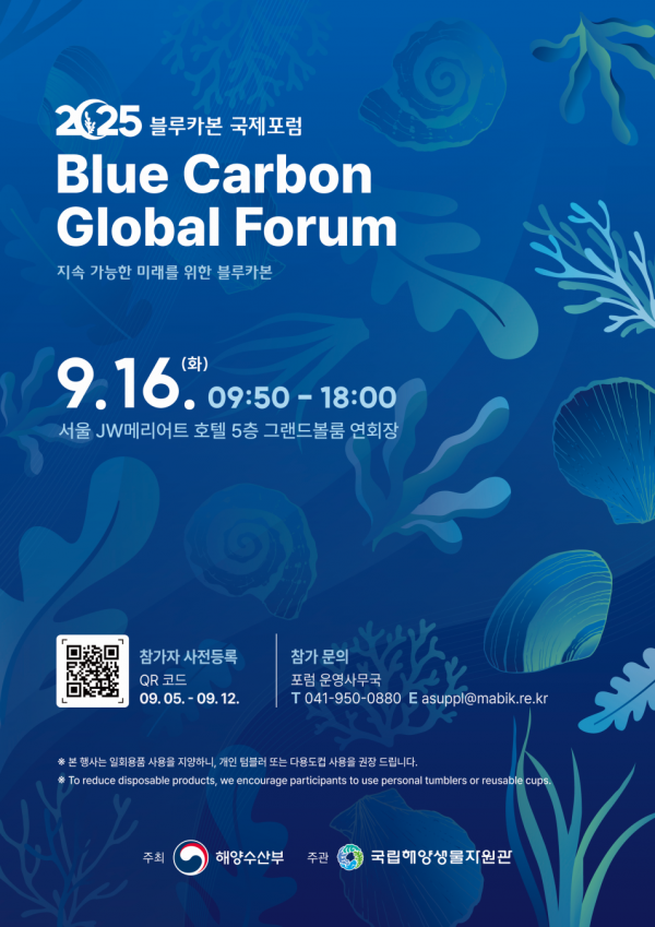 [금요저널] 해양수산부는 오는 9월 16일 서울 JW메리어트 호텔에서 국립해양생물자원관과 함께 ‘2025 블루카본 국제포럼'을 개최한다고 밝혔다.