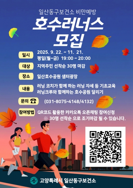 [금요저널] 고양특례시 일산동구보건소는 지역주민의 비만예방과 건강생활실천을 위한 러닝 프로그램 ‘호수RUN’을 오는 9월 22일부터 11월 21일까지 운영한다고 밝혔다.