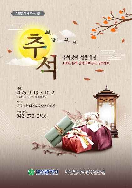 [금요저널] 대전시는 민족 최대의 명절 추석을 앞두고 지역 우수 상품을 널리 알리고 지역경제 활성화에 기여하기 위해 9월 19일부터 10월 2일까지 10일간 시청 1층 대전우수상품판매장에서 ‘추석맞이 선물대전’을 연다.