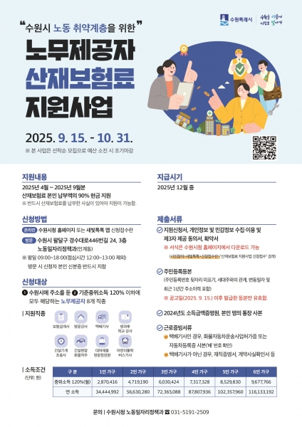[금요저널] 수원시는 10월 31일까지 ‘2025년 하반기 노동 취약계층 노무제공자 산재보험료 지원사업’ 신청을 받는다.