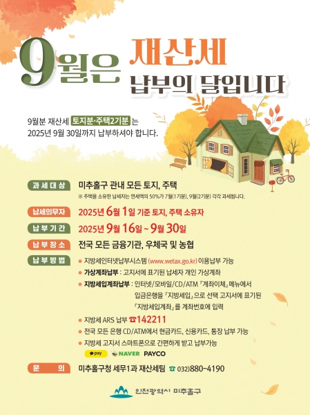 [금요저널] 인천 미추홀구는 9월 정기분 재산세 518억원, 21만 2천여 건을 부과했다고 16일 밝혔다.