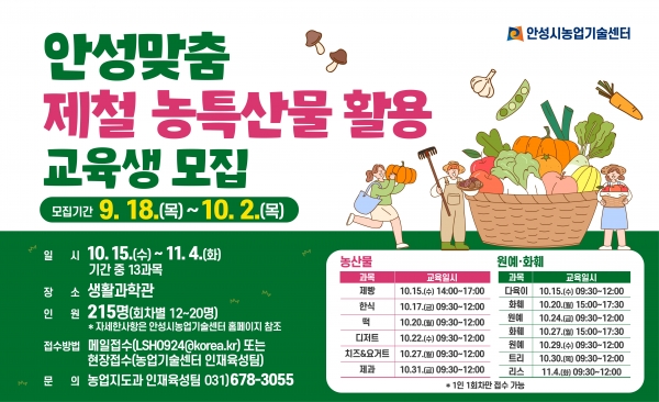 [금요저널] 안성시농업기술센터는 9월 18일부터 10월 2일까지 안성시 농특산물을 활용한 제철 농특산물 활용교육을 추진한다고 밝혔다.