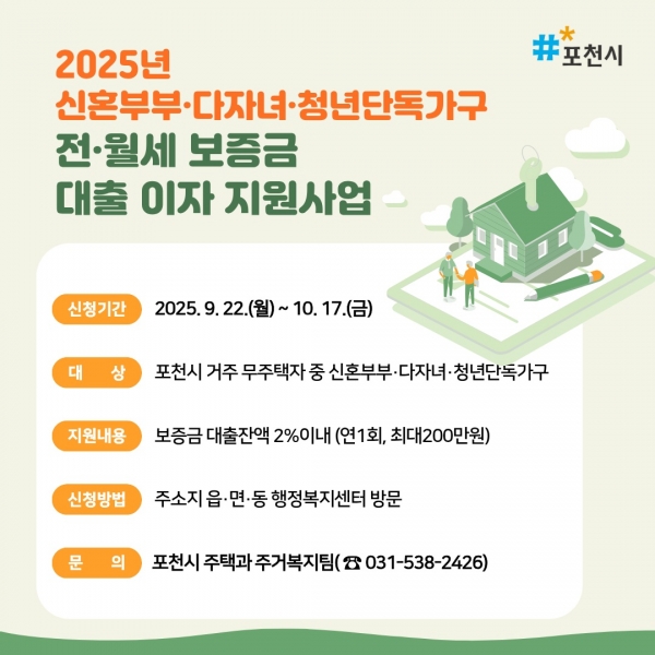 포천시, 신혼부부·다자녀·청년 1인 가구 전·월세 보증금 대출이자 지원사업 접수