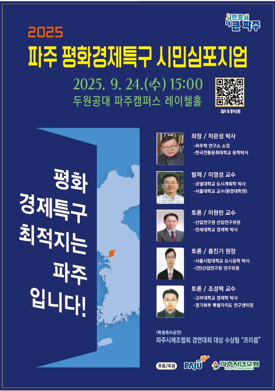 파주시가 주최하고 파주시민포럼이 주관하는 이 행사는 시민과 전문가가 함께 모여 파주 평화경제특구 조성의 실행방안과 발전 전략을 폭넓게 논의하는 자리다.