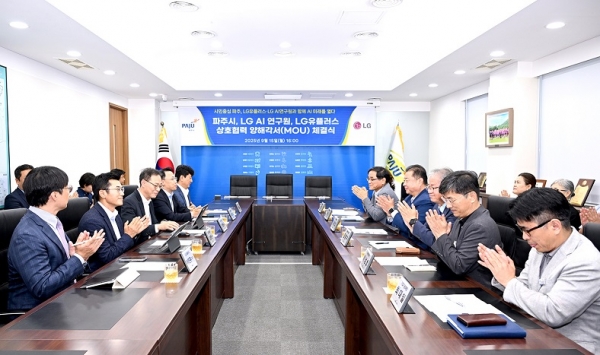 [금요저널] 파주시는 지난 9월 15일 시청 접견실에서 엘지에이아이연구원, 엘지유플러스와 ‘인공지능 혁신 협력 업무협약’을 체결했다고 밝혔다.