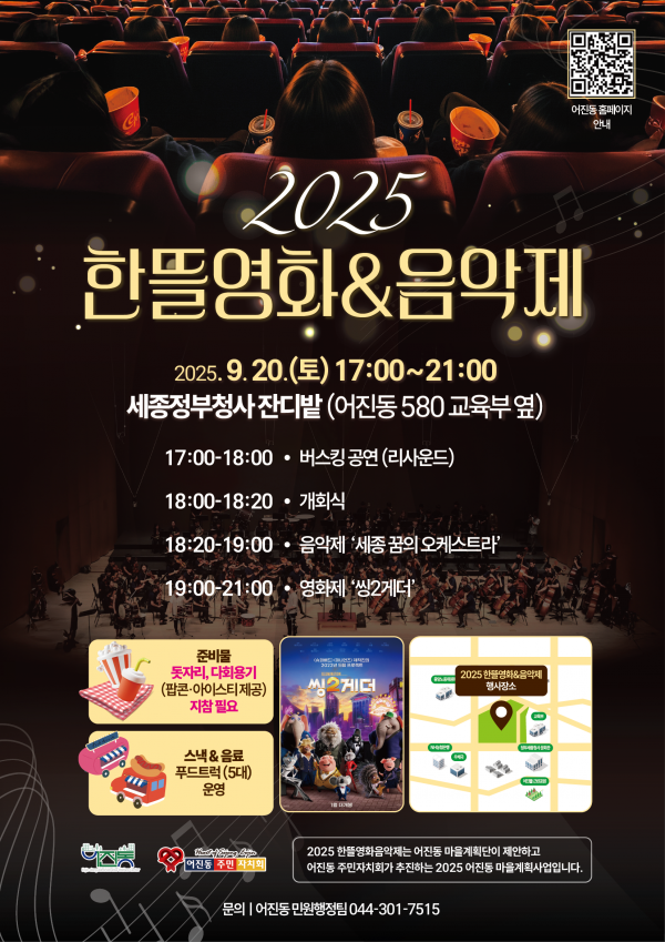 [금요저널] 세종시 어진동과 어진동 주민자치회가 오는 20일 오후 5시 정부세종청사 잔디밭에서 ‘2025 한뜰영화&음악제’를 개최한다.