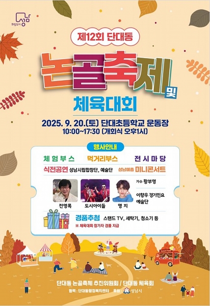 [금요저널] 성남시은 ‘제12회 단대동 논골축제’ 가 오는 9월 20일 오전 10시~오후 5시 30분 단대초등학교 운동장에서 열린다고 밝혔다.