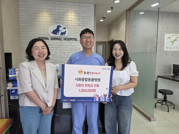 [금요저널] 시흥시 시화종합동물병원은 지난 9월 15일 정왕3동 취약계층을 지원하기 위해 추석맞이 후원금 100만원을 정왕3동 지역사회보장협의체에 전달했다.