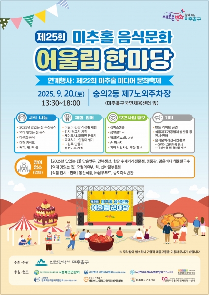 [금요저널] 인천 미추홀구는 오는 20일 숭의2동 제7노외주차장에서 ‘제25회 미추홀 음식문화 어울림 한마당’을 개최한다.