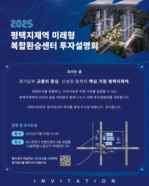 [금요저널] 평택시는 오는 29일 오후 2시, 서울 피스앤파크 컨벤션센터 로얄홀에서 ‘평택지제역 미래형 복합환승센터 투자설명회’를 개최한다고 밝혔다.