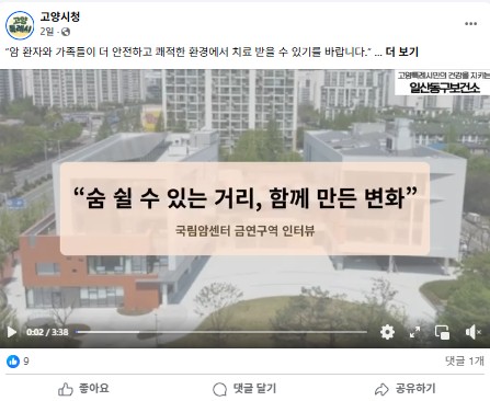 보건소 관계자는 “국립암센터는 환자와 보호자가 많이 찾는 공간으로 금연구역 지정은 간접흡연 피해 예방과 건강한 환경 조성에 중요한 의미가 있다”며 “이번 인터뷰 영상과 만족도 조사를 통해 정책 효과를 확인하고 시민 공감을 넓힐 수 있었다”고 밝혔다.