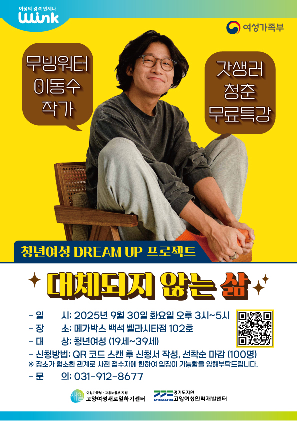 [금요저널] 고양여성새로일하기센터·고양여성인력개발센터는 청년 여성들의 진로 설계와 자기 개발을 지원하고자 오는 30일 오후 3시, 메가박스 백석벨라시타점에서 청년 여성 대상 무료 특강을 개최한다.