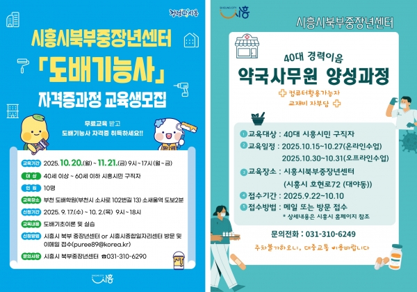 특히 10월에는 도배기능사 자격증 과정과 약국 사무원 양성 과정을 개설해 참여자를 모집하며 참여 신청은 9월 17일부터 10월 2일까지 시흥시북부중장년센터에 방문하거나 전자우편을 통해서도 가능하다.