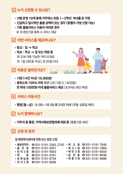 시범 동에 거주하는 초등 1~2학년 자녀 가정이 대상이고 맞벌이 가정과 기존 돌봄서비스 이용이 어려운 가정도 포함된다.