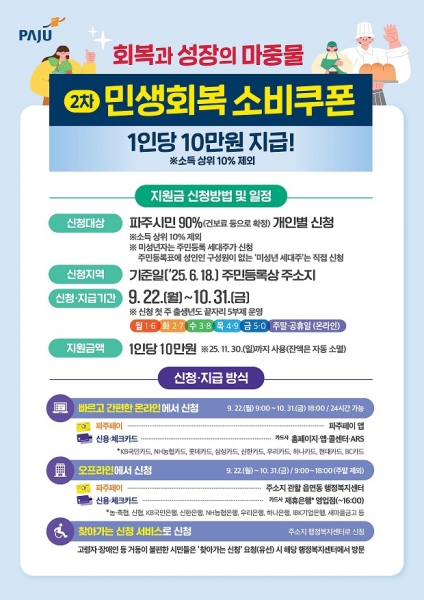 [금요저널] 파주시는 소비 활성화 및 자영업자 매출 확대를 통한 민생경제 회복을 위해 정부가 추진하는 ‘민생회복 소비쿠폰’ 2차 지급을 오는 22일부터 10월 31일까지 실시한다고 밝혔다.