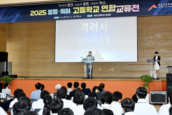 [금요저널] 파주시는 지난 17일 김경일 파주시장이 세경고등학교 대강당에서 열린 ‘2025 발명·특허 고등학교 연합교류전’ 개회식을 방문해 청소년을 위한 발명 교육의 활성화와 지역사회 협력을 강조했다.