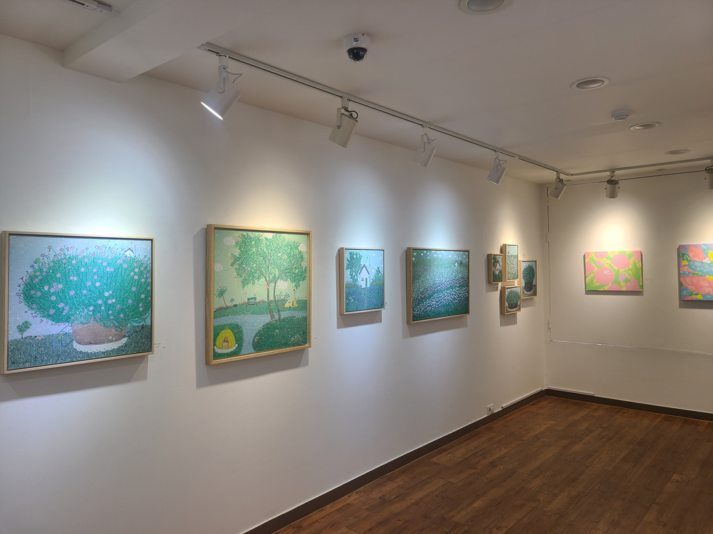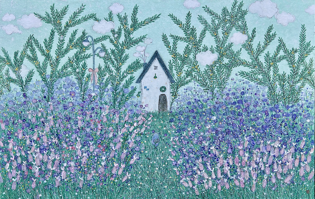 서소영 작가는 동화 속 배경처럼 활짝 핀 예쁜 꽃발 사이로 아름다운 집을 그렸다. 장지에 채색하여 은은하게 빛나는 풍경은 몽환적이면서도 한번은 거닐어 보고 싶었던 환상의 정원을 아름다운 이미지로 구현했다. 초록의 식물과 꽃 그리고 너무 작아서 자세히 봐야 보이는 풀꽃을 사랑하는 심성으로 그려 꽃망울마다 사랑, 행복, 평온의 긍정 메시지가 가득하다.