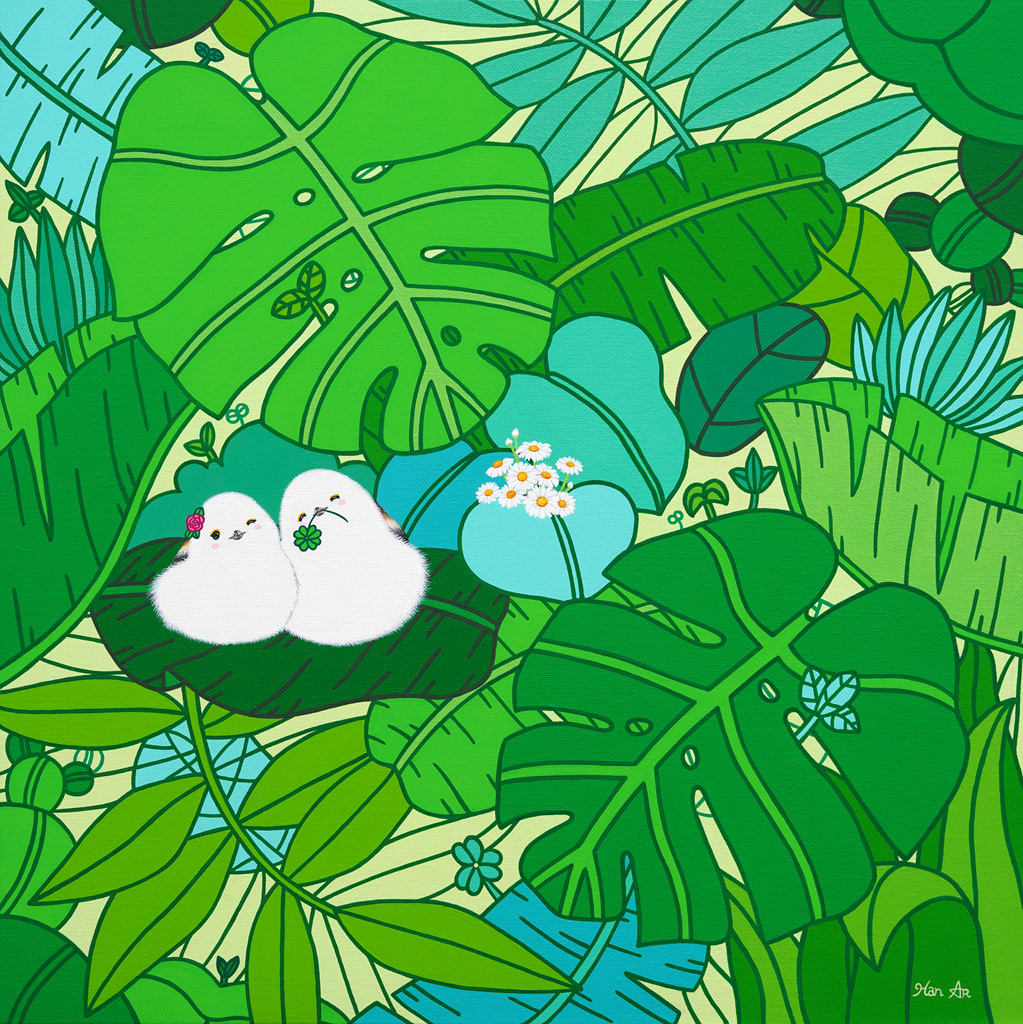 한아름 작가는 보호종인 흰머리 오목눈이 새와 열대 식물의 조화로운 구성으로 휴식과 위로를 전한다. 흰머리 오목눈이와 더불어 작품에 반복적으로 등장하는 식물 ‘몬스테라’는 아래쪽 잎에 햇빛을 가리지 않기 위해 스스로 찢어진 잎을 만든다. 이런 몬스테라의 배려심과 사려 깊음이 중심 소재로 등장하며 치유와 안식의 공간이 될 유토피아 배경을 만들었다.