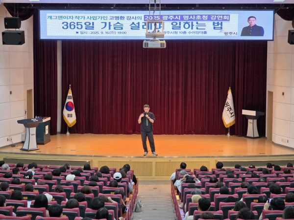 [금요저널] 광주시는 지난 16일 오후 7시 시청 10층 수어장대홀에서 400여명의 시민이 참석한 가운데 방송인·작가·사업가로 활동 중인 고명환 강사를 초청해 ‘365일 가슴 설레며 일하는 법’을 주제로 한 ‘2025년 제2회 명사 초청강연회’를 개최했다.