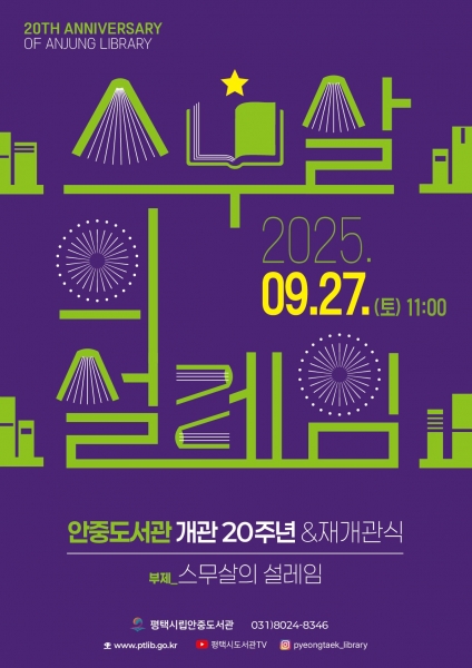 2005년 5월 30일 개관한 안중도서관은 올해 20주년을 맞아 ‘스무살의 설레임’ 주제로 재개관식을 개최하고 이용자 중심 도서관으로 새롭게 시작한다.