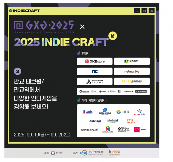 [금요저널] 대한민국 대표 인디게임 축제 ‘2025 인디크래프트’ 가 오는 9월 19일부터 20일까지 이틀간 성남게임문화축제 GXG와 함께 판교역 광장에서 열린다.