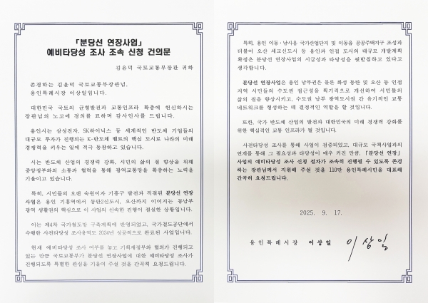 이상일 시장은 “이 두 사업은 교통 편의를 넘어 국가 산업 발전과 지역 균형발전을 위한 토대”며 “앞으로도 시민들의 염원이 실현될 수 있도록 중앙정부와 국회, 인접 도시들과 긴밀히 협력해 사업이 추진 될 수 있도록 최선을 다하겠다”고 말했다.