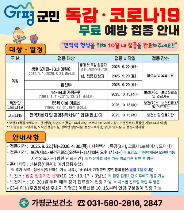 9월 22일부터는 어린이 생애 첫 독감 접종자, 9월 29일에는 어린이 1회 접종 대상자와 임신부, 10월 15일에는 65세 이상 어르신과 14~64세 가평군민을 대상으로 내년 4월 30일까지 접종이 이어진다.