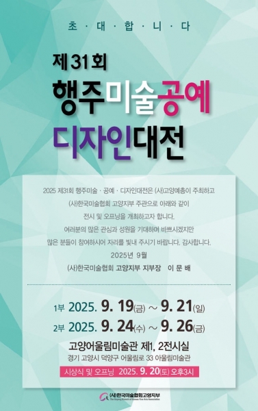 [금요저널] 고양특례시가 후원하고 한국미술협회 고양지부가 주관하는 ‘제31회 고양 행주 미술·공예·디자인 대전’ 이 9월 19일부터 26일까지 어울림미술관 제1·2전시실에서 개최된다.
