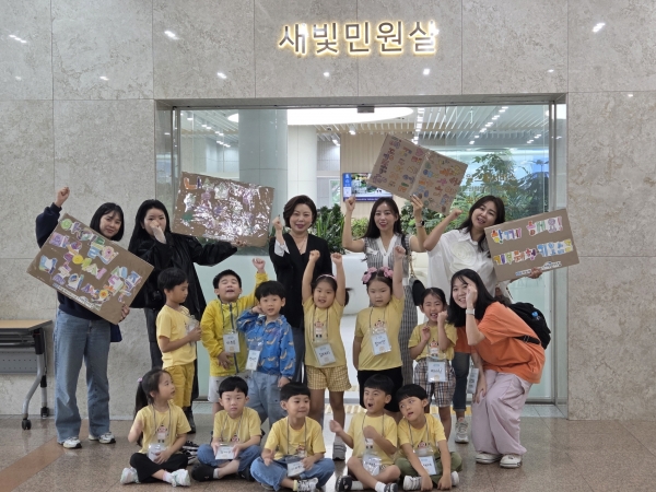 수원시청 통합민원실을 방문한 시립하늘채더퍼스트1 어린이집 원아, 교사들이 기념촬영을 하고 있다.