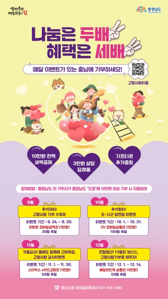 [금요저널] 충남도는 고향사랑기부제에 대한 관심과 참여를 높이기 위해 연말까지 다채로운 이벤트를 실시한다고 22일 밝혔다.
