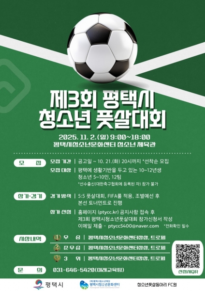 이번 대회는 청소년들에게 건전한 여가 활동을 제공하고 스포츠를 통한 협동심과 건강한 경쟁 문화를 조성하기 위해 마련됐으며 평택시에 생활 기반을 두고 있는 2010~2012년생 청소년으로 구성된 팀은 선착순으로 신청이 가능하다.