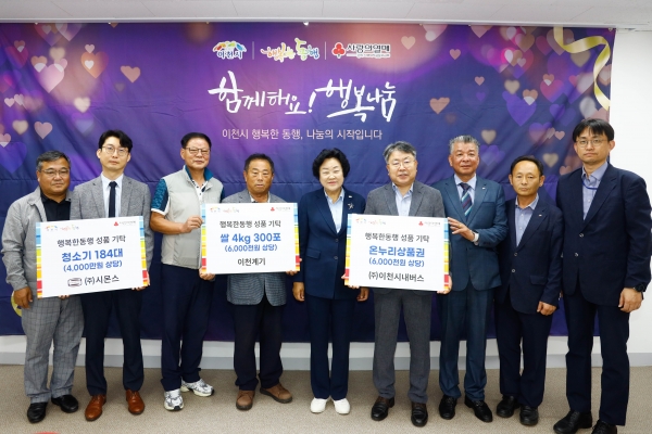 이날 △㈜이천시내버스는 온누리상품권 600매를, △㈜시몬스는 청소기 184대를, △이천계기는 햅쌀 4kg 300포를 각각 기탁하며 이웃사랑을 실천했다.