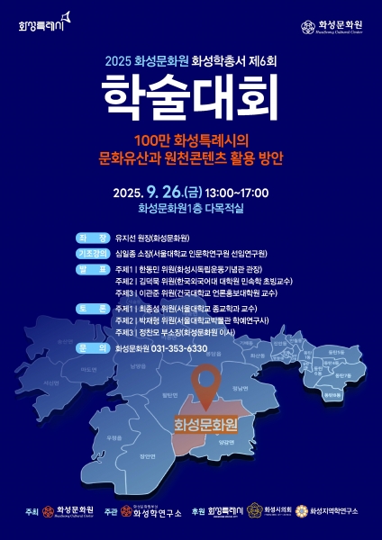 [금요저널] 화성특례시는 오는 9월 26일 오후 1시부터 5시까지 화성문화원 1층 다목적실에서 ‘화성학총서 제6회 학술대회’ 가 열린다고 밝혔다.