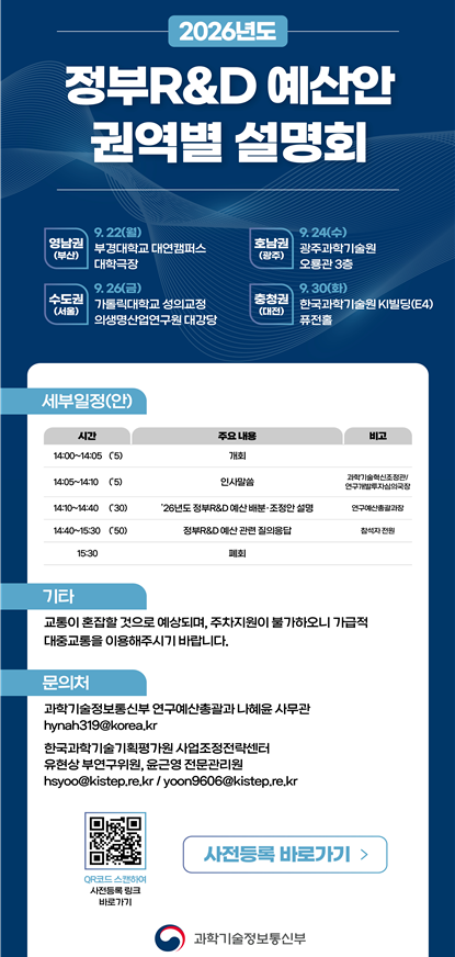 [금요저널] 과학기술정보통신부 과학기술혁신본부는 9월 22일부터 수도권, 충청권, 호남권, 영남권 등 4개 권역에서 2026년도 국가연구개발사업 예산안 권역별 설명회를 개최한다고 밝혔다.