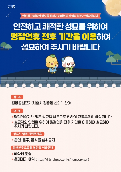 [금요저널] 시흥시는 추석 연휴를 앞두고 성묘객 집중에 따른 안전사고를 예방하고 시민 편의를 높이기 위해 명절 연휴 전후 여유 성묘 캠페인을 추진하고 있다.