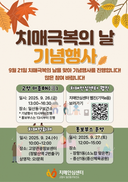 26일에는 치매극복의 날 행사‘고양 마음ON’을 일산동구보건소에서 오후 3시에 개최한다.