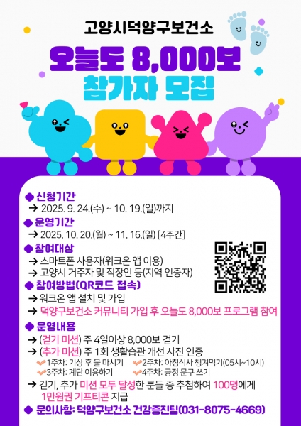 [금요저널] 고양특례시 덕양구보건소는 신체활동을 증가시키고 지속가능한 건강 습관 형성을 위해 오는 10월 20일부터 11월 16일까지 ‘오늘도 8,000보’ 프로그램을 운영한다고 밝혔다.