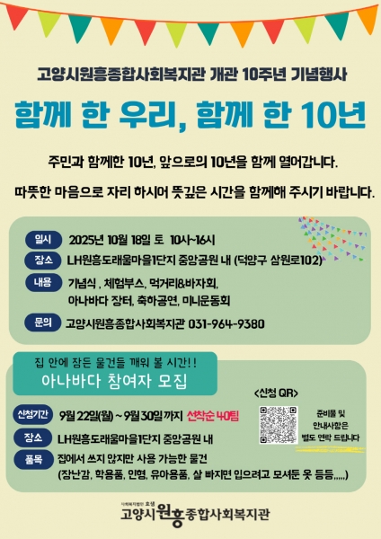 [금요저널] 고양시원흥종합사회복지관은 오는 10월 18일 오전 10시부터 오후 4시까지 도래울마을1단지 중앙공원에서 개관 10주년 기념행사 ‘함께한 우리 함께한 10년’을 개최한다.