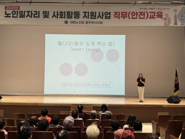 [금요저널] 동두천시정신건강복지센터는 9월 19일 동두천시민회관에서 노인 일자리 및 사회활동 지원사업 참여 어르신을 대상으로 ‘웰다잉’을 주제로 한 성인 정신건강 교육을 진행했다.