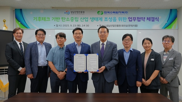 [금요저널] 성남산업진흥원과 한국수력원자력이 기후위기 대응 이라는 국가적 과제 속에서 탄소중립 사회 실현을 위한 기후테크 산업 생태계 조성에 협력하기로 했다.