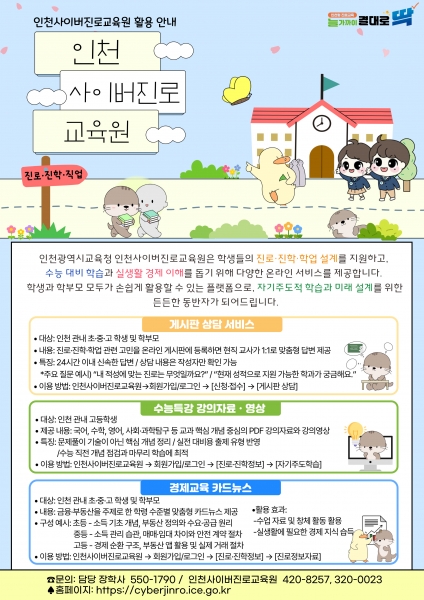 인천시교육청 관계자는 “이번 신규 콘텐츠는 경제 소양부터 대입 준비까지 학생들의 다양한 요구를 반영했다”며 “교육원 자료를 적극 활용해 자신감 있게 미래를 준비하길 바란다”고 말했다.