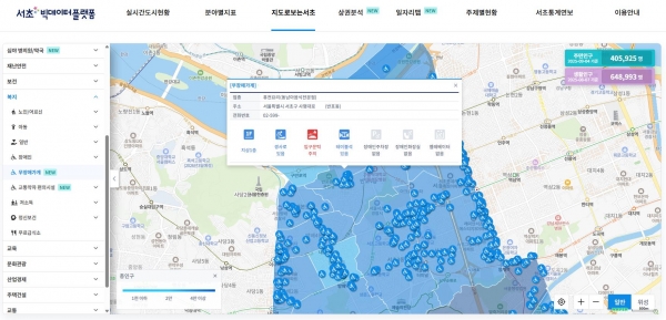‘서초 빅데이터플랫폼’은 주민들에게 재난안전·교통·대기 관련 실시간 상황부터 인구·보건·복지까지 11개 분야 485여종의 정보를 제공하는 행정 서비스 웹페이지다.