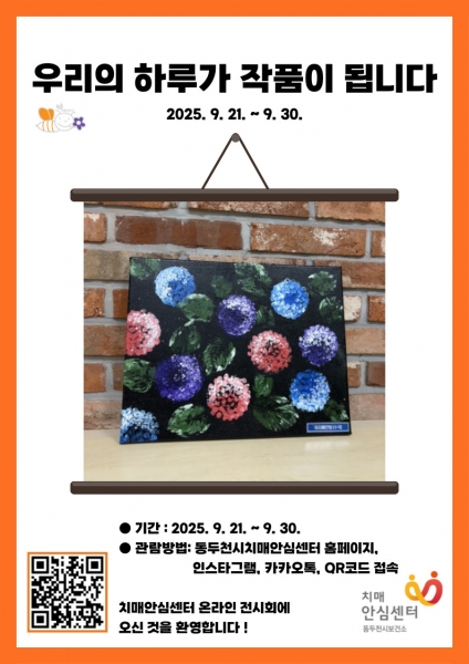 관람을 원하는 시민은 동두천시치매안심센터 홈페이지와 카카오톡 채널, 또는 포스터의 QR코드를 통해 온라인 전시를 자유롭게 감상할 수 있다.