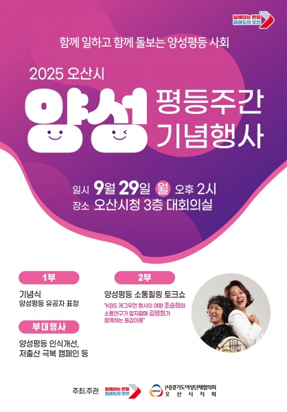 [금요저널] 오산시는 오는 9월 29일 오후 2시, 오산시청 3층 대회의실에서 ‘2025년 양성평등주간 기념행사’를 개최한다고 밝혔다.