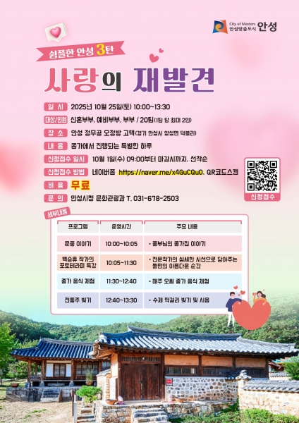 [금요저널] 안성시는 오는 10월 25일 오전 10시부터 오후 1시 30분까지 양성면 덕봉리에 위치한 안성 정무공오정방고택에서 ‘ 쉼플한 안성 3탄, 사랑의 재발견’을 운영한다.