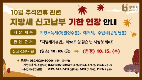 [금요저널] 부천시는 긴 추석 연휴로 인해 시민들이 지방세를 기한 내에 신고·납부하는 데 불편을 겪을 것으로 예상됨에 따라, 10월 납부 대상인 지방세 3종의 신고·납부 기한을 기존 10일에서 15일로 5일 연장한다고 밝혔다.