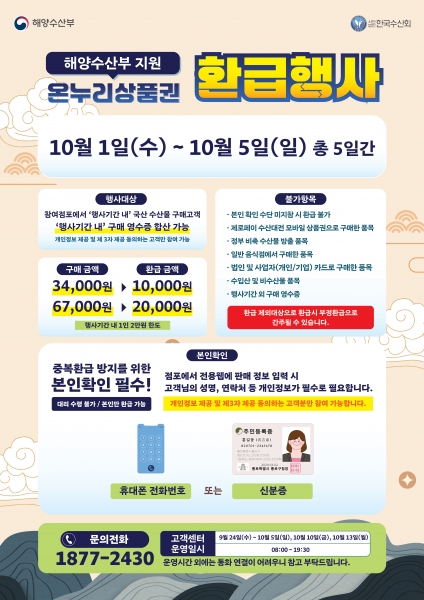 이번 행사는 10월 1일부터 10월 5일까지 5일간 진행되며 △신거북·거북시장 △강남시장 △가좌시장에서는 국산 수산물 구매 시, △인천축산물시장에서는 국산 농축산물 구매 시 온누리상품권 환급 혜택이 제공된다.