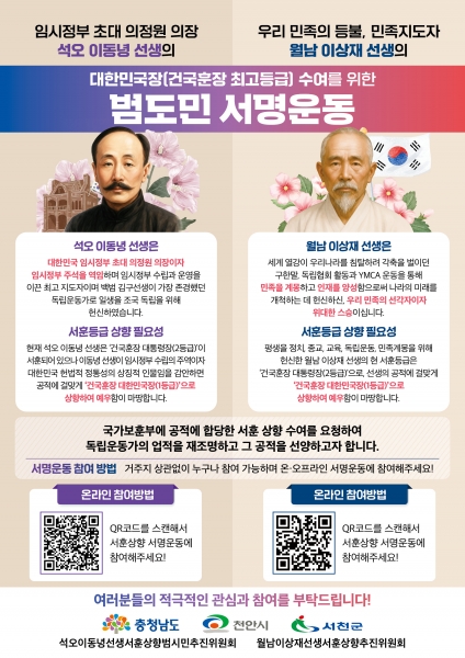 이에 도는 10만명 이상 서명 참여를 목표로 지역에서부터 두 선생의 공적을 재조명할 수 있도록 천안시와 서천군, 기념사업회 등과 협업체계를 강화하는 등 행정력을 집중하고 있다.