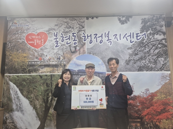 김영미 불현동장은 “매년 따뜻한 마음으로 나눔을 실천해 주시는 장용원 어르신께 깊이 감사드린다”며 “기탁금은 어르신의 뜻에 따라 어려운 이웃을 위해 소중히 사용하겠다”고 말했다.