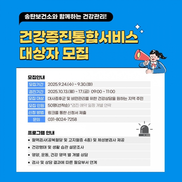 ‘‘건강증진 통합서비스’는 체성분 검사, 복부둘레, 혈압, 공복혈당, 고지혈증 검사 등 기초검진을 하고 건강행태 및 생활 습관 설문 결과를 기반으로 맞춤형 건강상담과 교육이 제공되며 필요시 운동·영양·금연·심뇌혈관 예방관리 등 전문 상담 관련 사업을 연계해 대상자 중심의 통합건강관리를 지원한다.